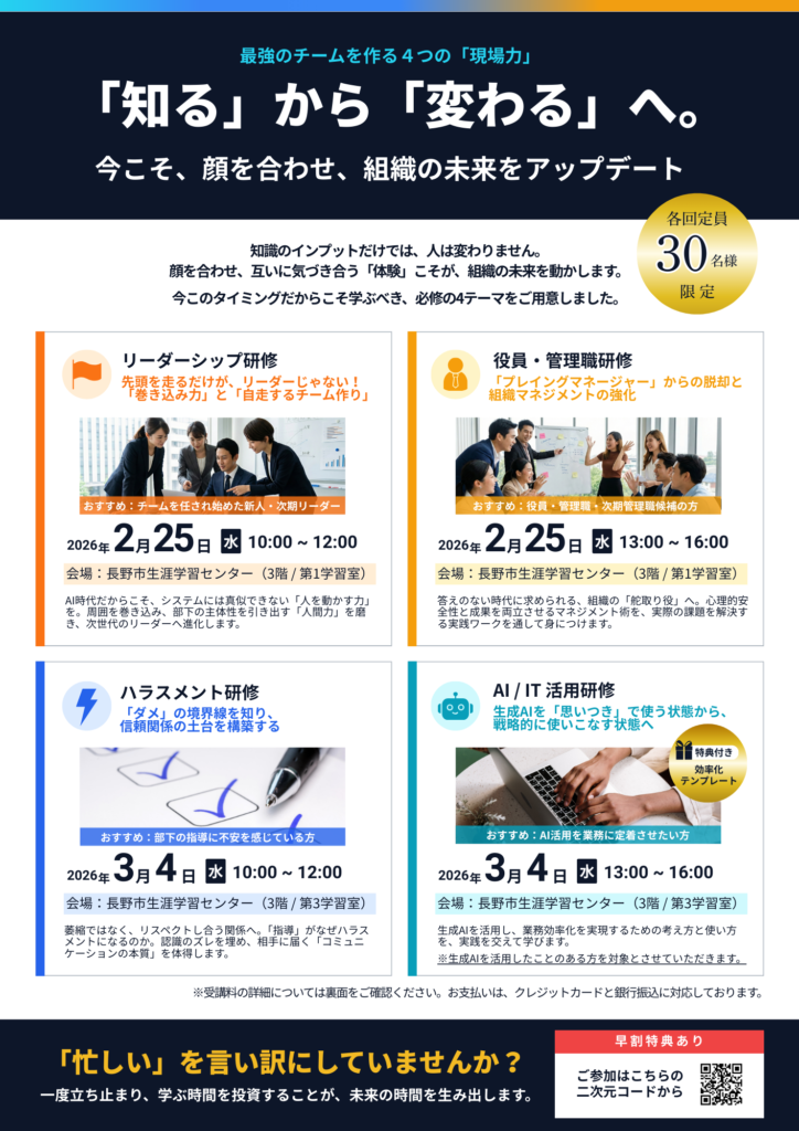 過去にご好評いただいたテーマの中から、2026年度の組織づくりに欠かせない4つを厳選。